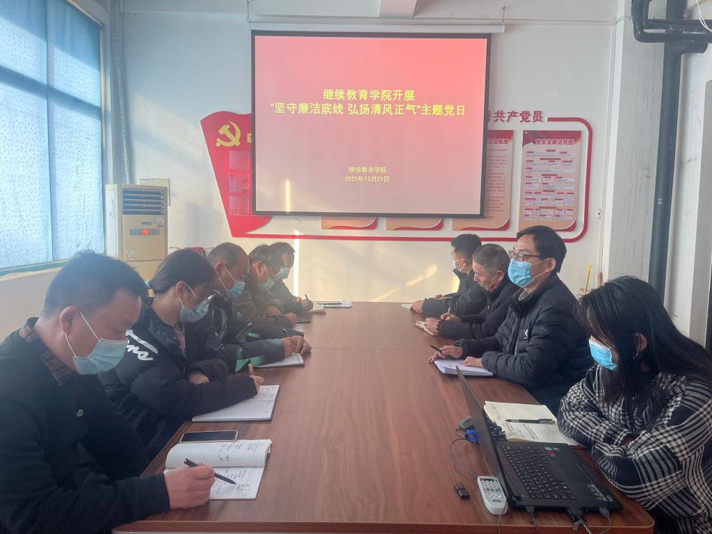 2021年12月21日,继续教育学院组织全体教职工在会议室开展“坚守廉洁底线 弘扬清风正气”主题党日,会议由党支部书记杜广平主持。