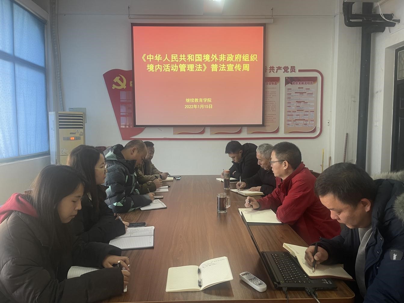 为深入贯彻习近平法治思想和党的十九届六中全会精神,进一步引导规范境外非政府组织在豫开展教育交流活动,维护社会政治稳定,确保党的二十大顺利召开,根据全国普法办公室和我省境外非政府组织工作协调小组的通知以及河南省教育厅办公室《关于组织开展<境外非政府组织境内活动管理法>实施五周年普法宣传周活动的通知》(教外函〔2022〕7号)文件要求,按照学校通知, 2022年1月15日,继续教育学院在会议室召开《中华人民共和国境外非政府组织境内活动管理法》普法宣传,会议由院长薛建荣主持,全体教职工参加。