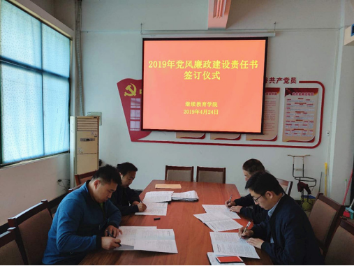 2019年4月22日继续教育学院院长杜广平组织科级以上干部集体签署了党风廉政建设和反腐败工作责任书。杜院长指出:一、严格遵守《中国共产党章程》,自觉执行《中国共产党廉洁自律准则》、《中国共产党党内监督条例》等廉洁自律各项规定,坚定政治立场,牢固树立“四种意识”,坚定不移维护党中央权威和党中央集中统一领导。二、落实全面从严治党主体责任,认真履行“一岗双责”。严格按民主集中制原则办事,对职责范围内的党风廉政建设切实负起领导职责。三、严格执行中央八项规定和省委省政府20 条意见,坚决反对“四风”,向组织如实报告个人重大事项,做到对党忠诚,知行合一,表里如一。四、坚持廉洁奉公,不利用职权和职务上的影响谋取不正当利益。不出入私人会所,不接受和持有私人会所会员卡。五、认真践行社会主义核心价值观,牢记全心全意为人民服务宗旨,自觉做修身慎行、清廉自守的模范。