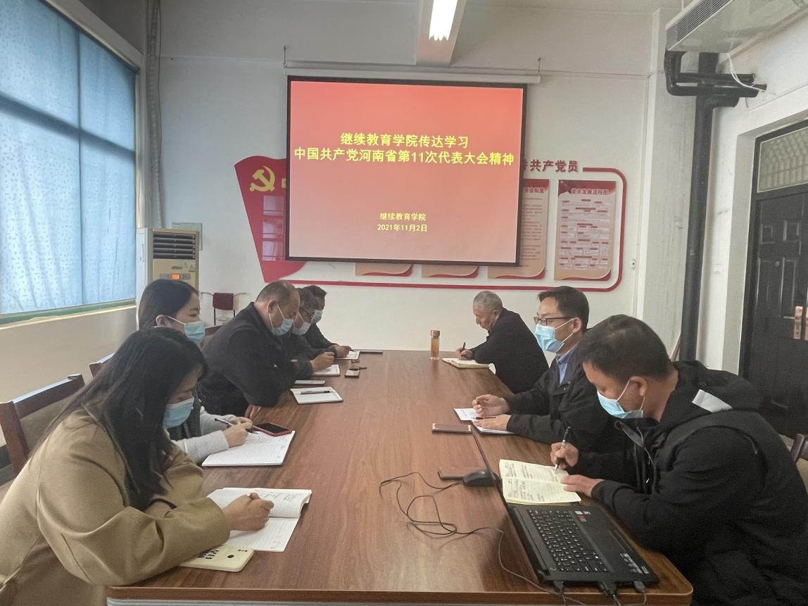 2021年11月2日,继续教育学院在4号教学楼四楼会议室召开专题会议,传达学习中国共产党河南省第十一次代表大会精神,会议由继续教育学院院长杜广平主持,全体教职工参加。