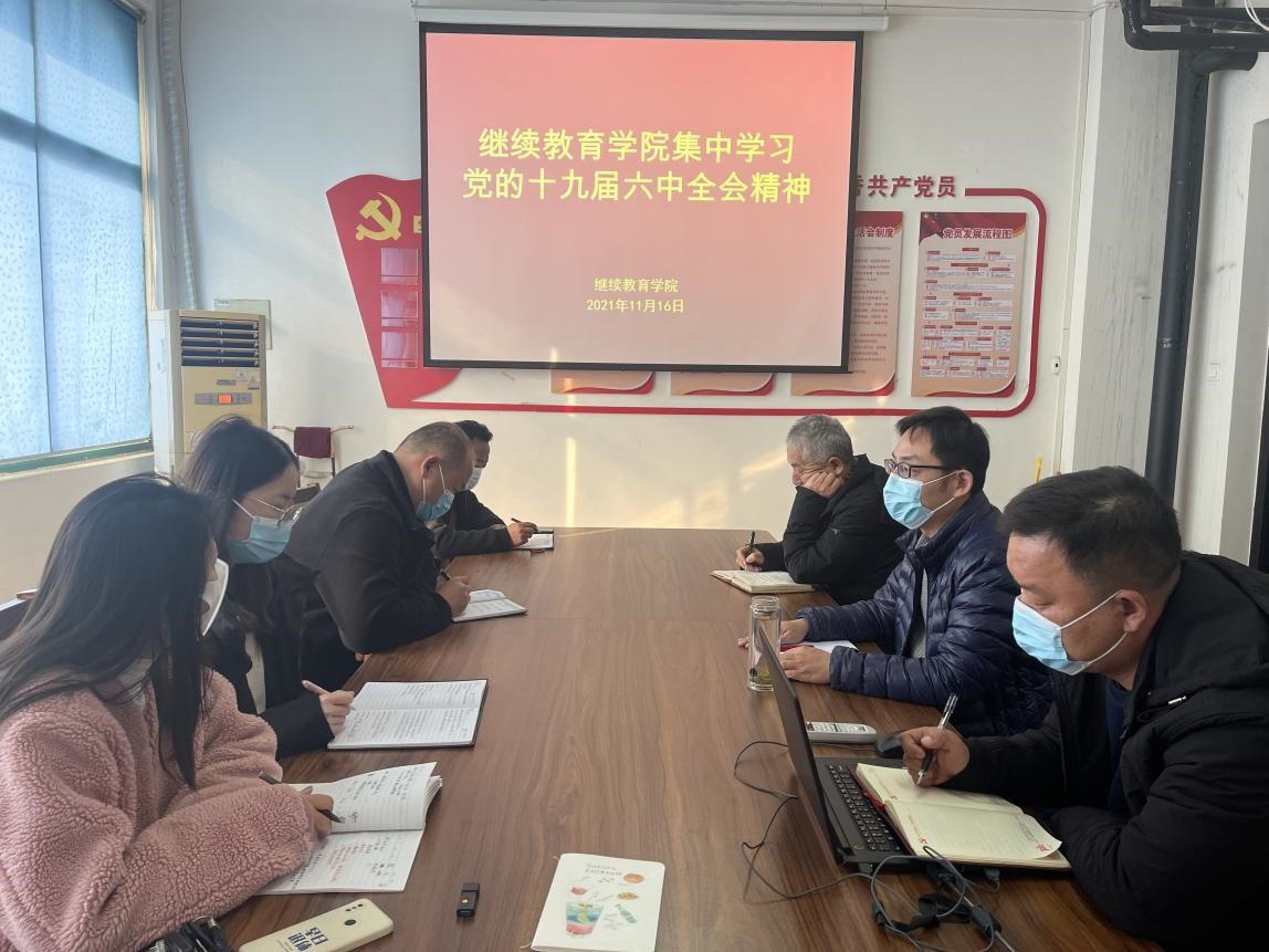 2021年11月16日,继续教育学院在4号教学楼四楼会议室集中学习党的十九届六中全会精神,深入领会党的十九届六中全会精神实质和丰富内涵。