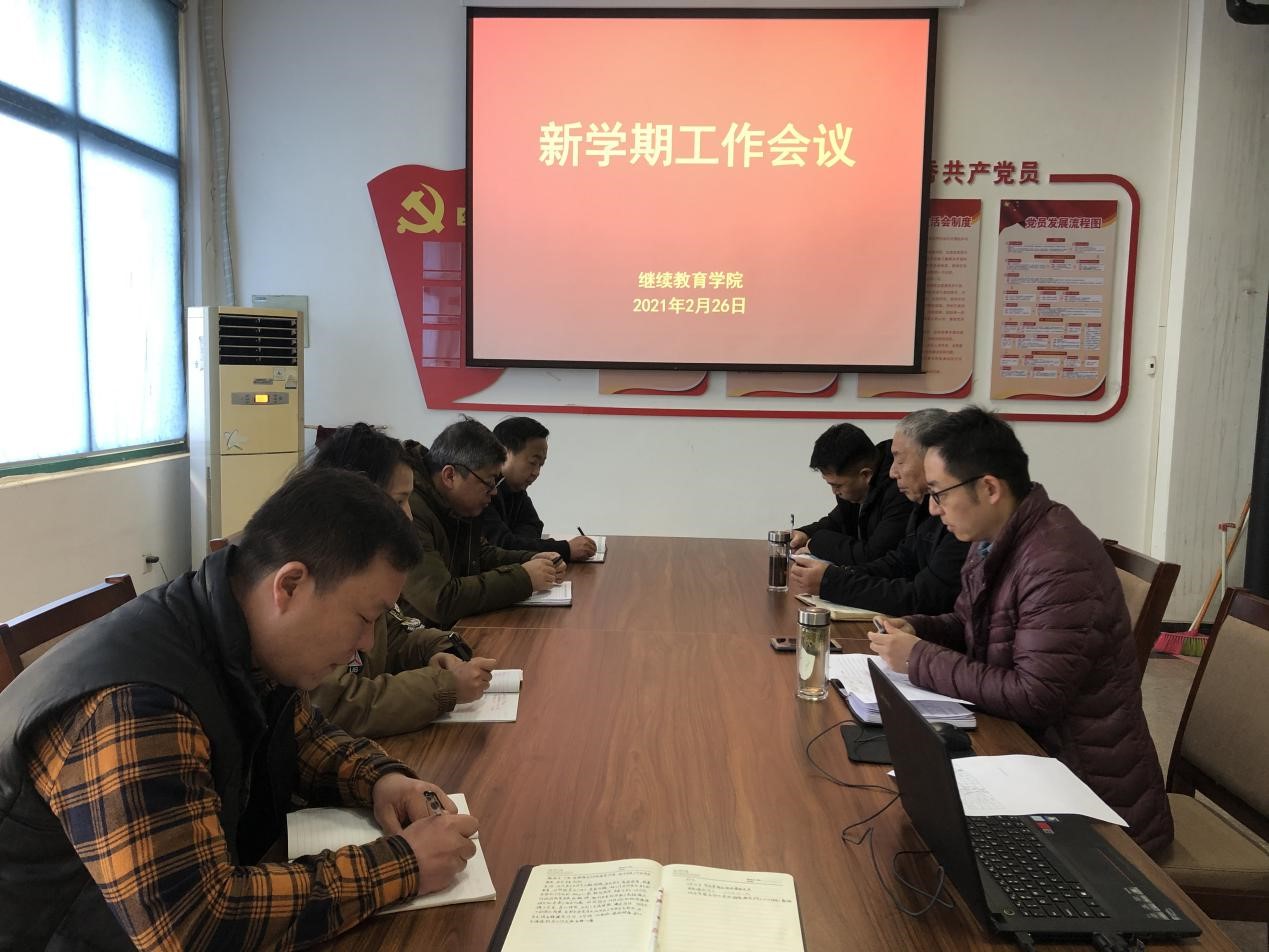 2021年2月26日上午,继续教育学院在四号楼会议室召开新学期工作会议,会议由院长杜广平主持,全体教职工参加会议。