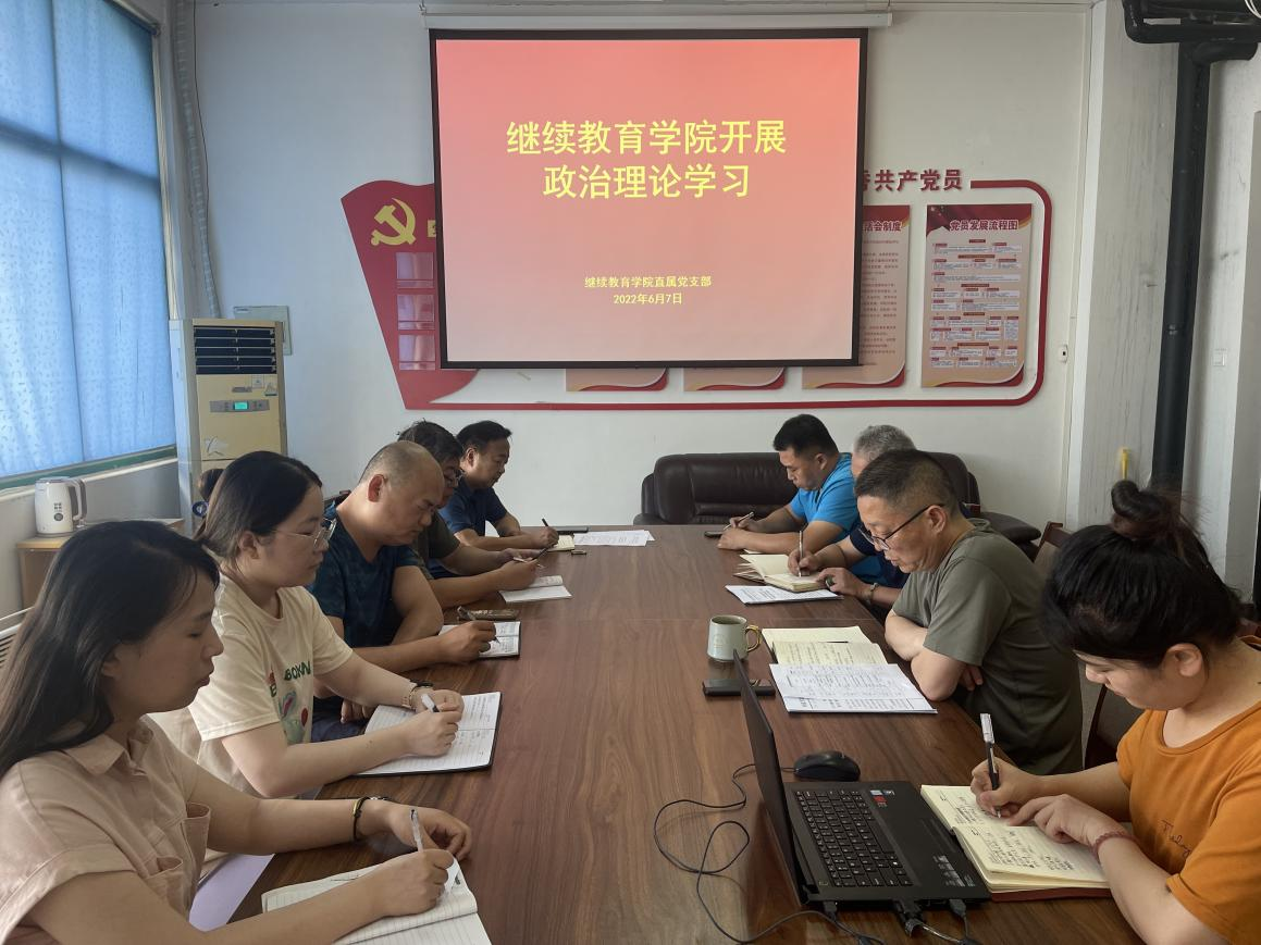 2022年6月7日,继续教育学院在4号教学楼四楼会议室开展政治理论学习,会议由党支部书记薛建荣主持,全体教职工参加。