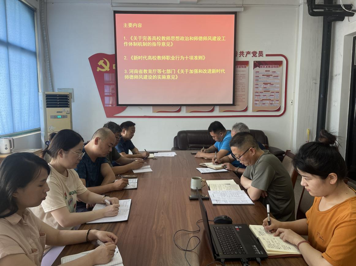 会上集中学习了河南省教育厅等七部门《关于加强和改进新时代师德师风建设的实施意见》、《关于完善高校教师思想政治和师德师风建设工作体制机制的指导意见》和《新时代高校教师职业行为十项准则》等内容。
