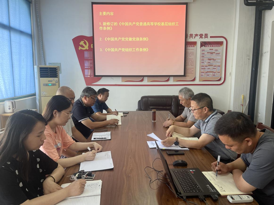 会上集中学习了《中国共产党普通高等学校基层组织工作条例》、《中国共产党党徽党旗条例》及《中国共产党组织工作条例》等内容。