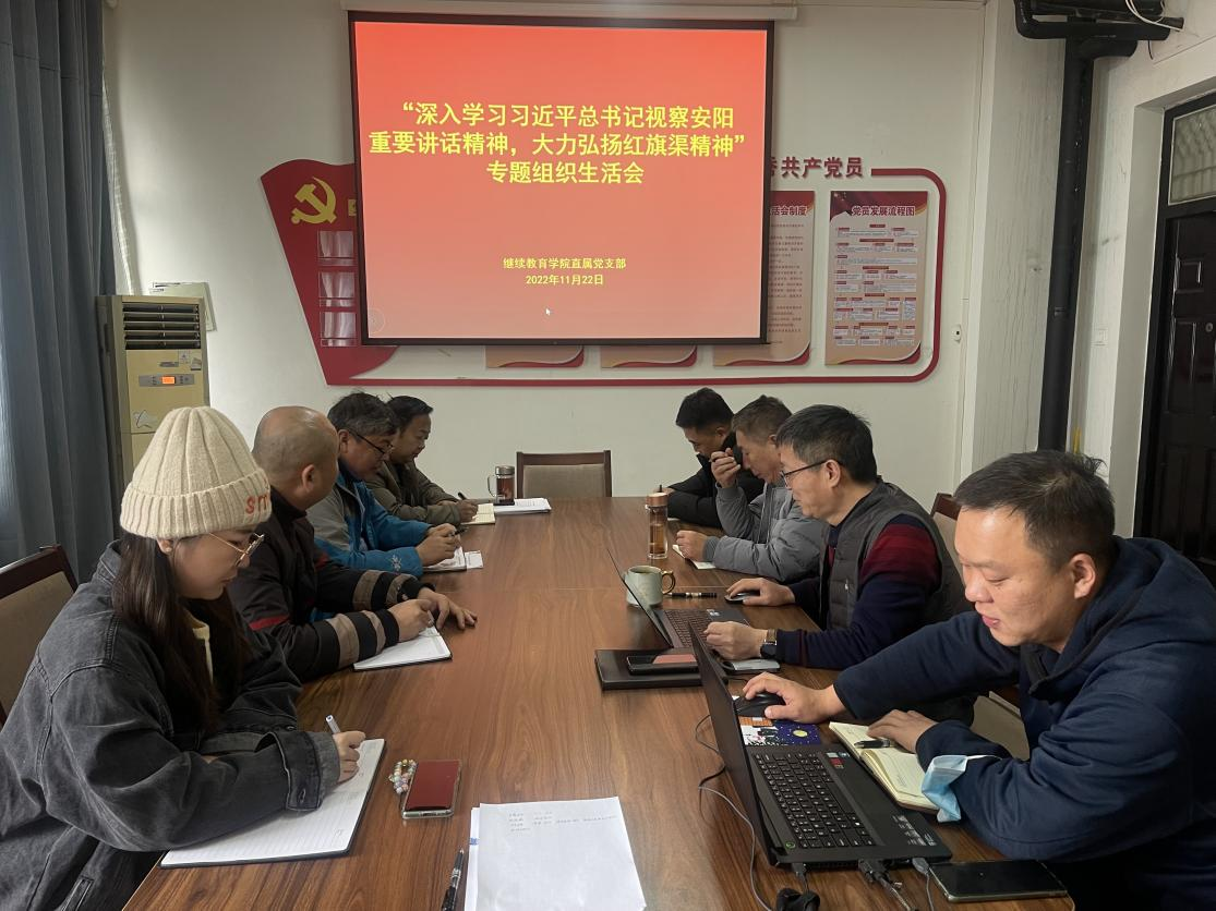为深入学习贯彻党的二十大精神和习近平总书记视察河南安阳重要讲话精神,2022年11月22日,继续教育学院在4号教学楼四楼会议室召开“深入学习习近平总书记视察安阳重要讲话精神,大力弘扬红旗渠精神”专题组织生活会,会议由党支部书记薛建荣主持,全体教职工参加。