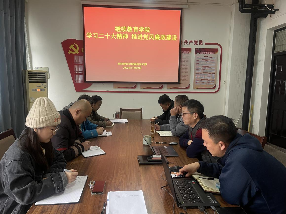 为深入学习贯彻党的二十大精神,扎实推进党风廉政建设工作,10月22日,继续教育学院在4号教学楼四楼会议室开展“学习二十大精神 推进党风廉政建设”主题党日,会议由院长薛建荣主持,全体教职工参加。