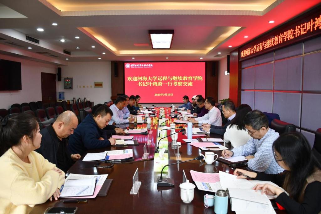 3月10日上午,河海大学远程与继续教育学院书记叶鸿蔚一行9人到36365官网就“继续教育教学评估”及“高职院校师资队伍人才培训合作需求”进行考察交流。36365官网党委委员、副校长菅浩然出席座谈会,继续教育学院领导及相关负责人参加会议。