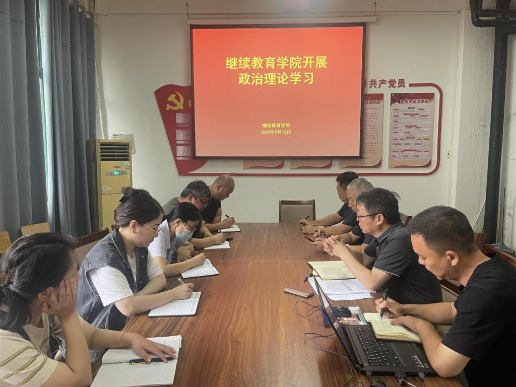 2023年9月12日,继续教育学院在4号教学楼四会议室开展政治理论学习,会议由党支部书记薛建荣主持,全体教职工参加。