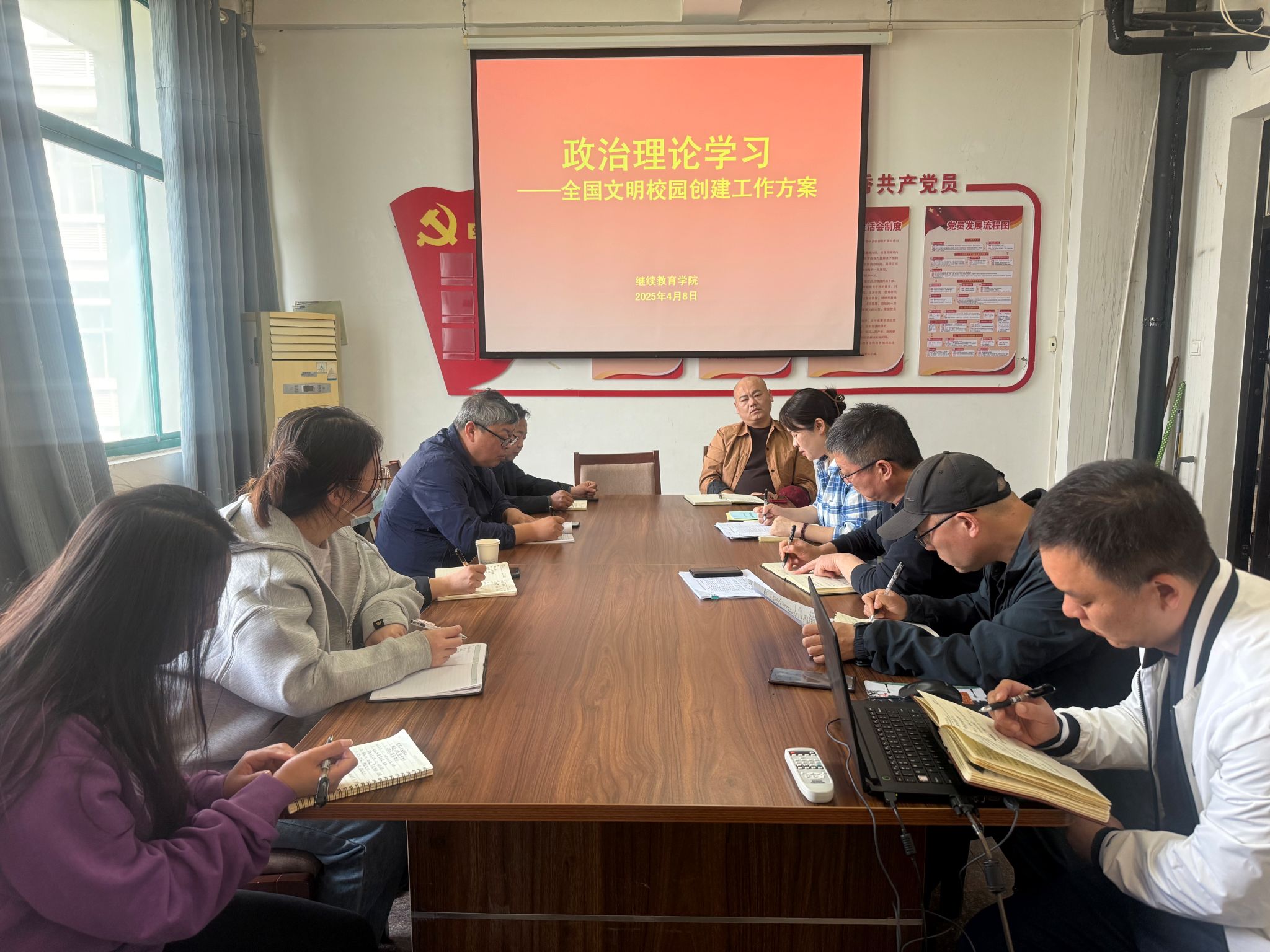 2025年4月8日,继续教育学院在4号教学楼四楼会议室开展政治理论学习,会议由院长薛建荣主持,全体教职工参加。