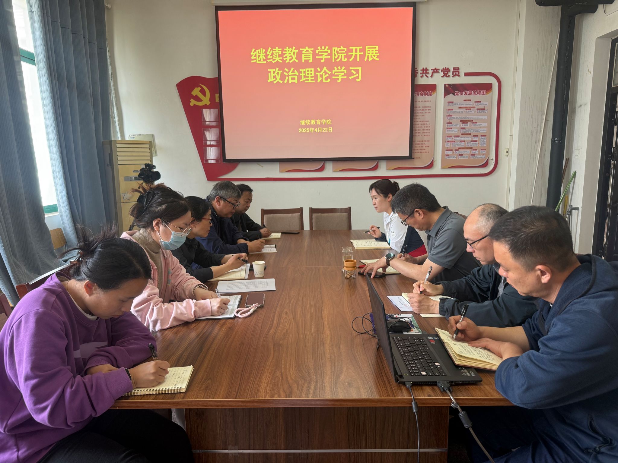 4月22日,继续教育学院在4号教学楼四楼会议室开展政治理论学习,会议由院长薛建荣主持,全体教职工参加。