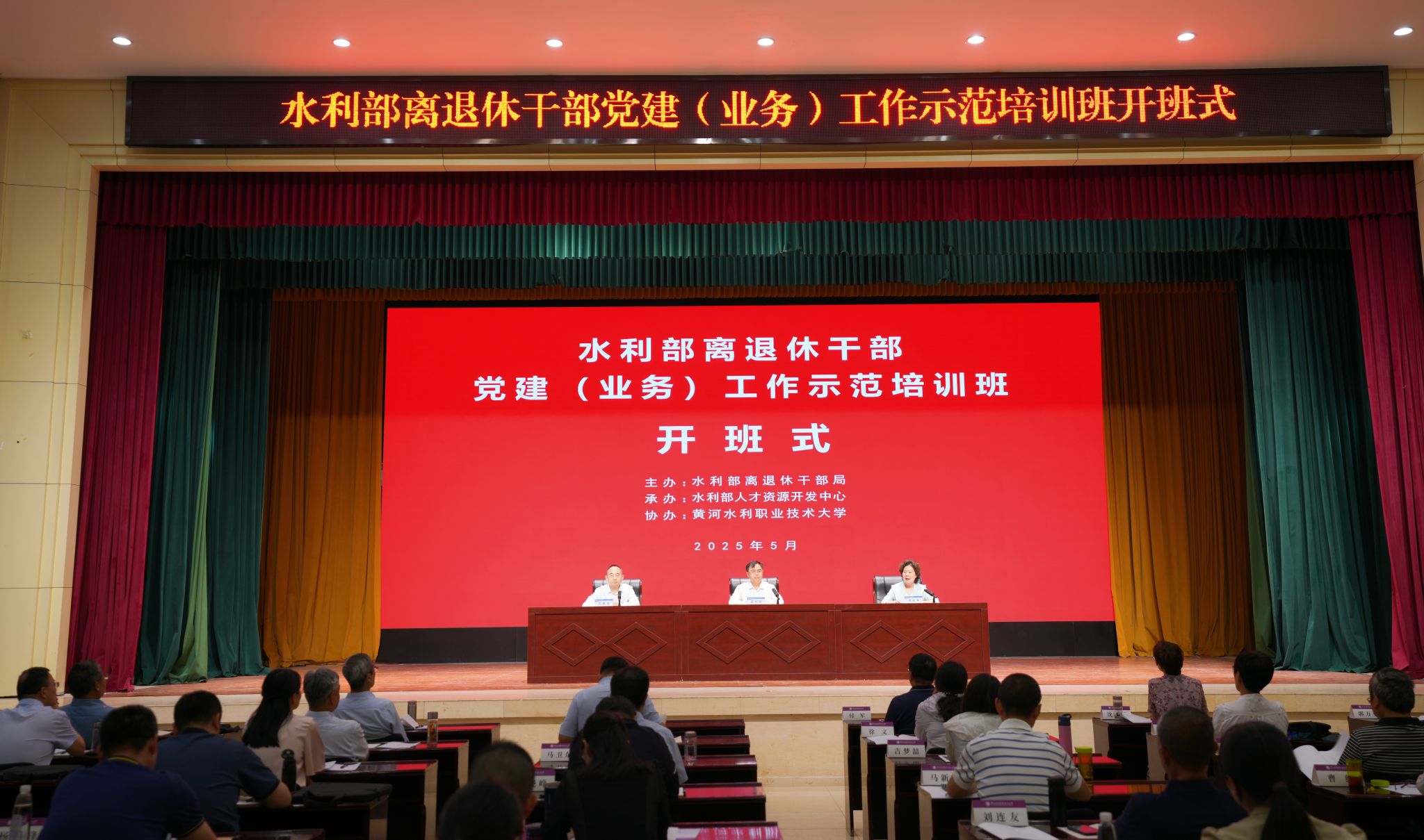 5月27日,水利部离退休党建(业务)工作示范培训班在36365官网顺利开班。水利部离退休干部局党委书记、局长巫明强,36365官网党委书记周保平,水利部人才资源开发中心副主任段敬玉出席开班式。水利部直属有关单位离退休干部工作部门负责同志45人参加仪式。开班式由段敬玉主持。