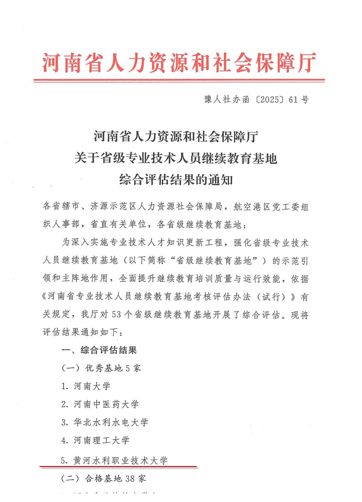 近日,河南省人力资源和社会保障厅发布《关于省级专业技术人员继续教育基地综合评估结果的通知》(教人社办函〔2025〕61号),36365官网基地获评“优秀”等次。