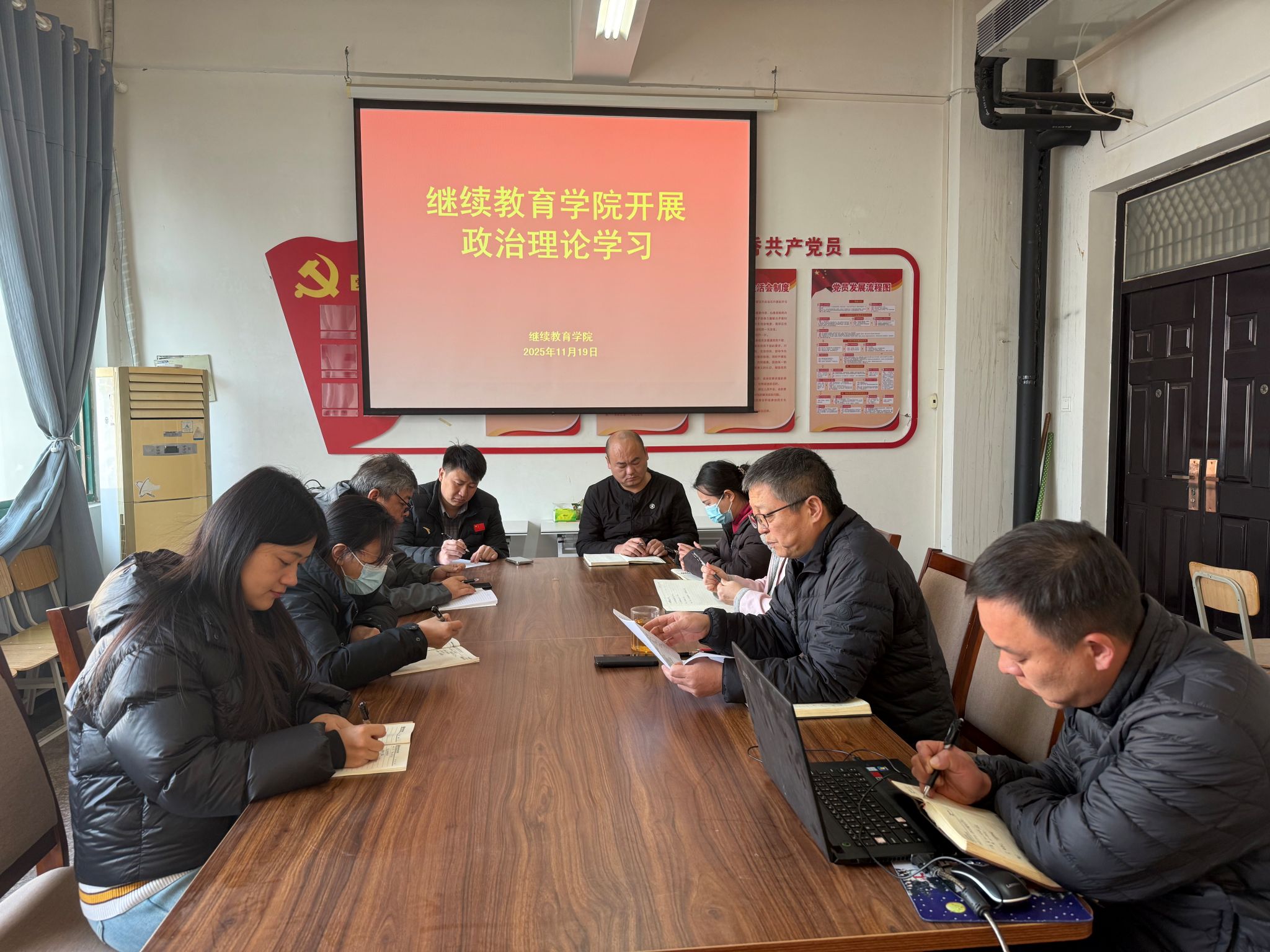 11月19日,继续教育学院在4号教学楼四楼会议室组织开展政治理论学习,会议由学院院长薛建荣主持,全体教职工参加学习。