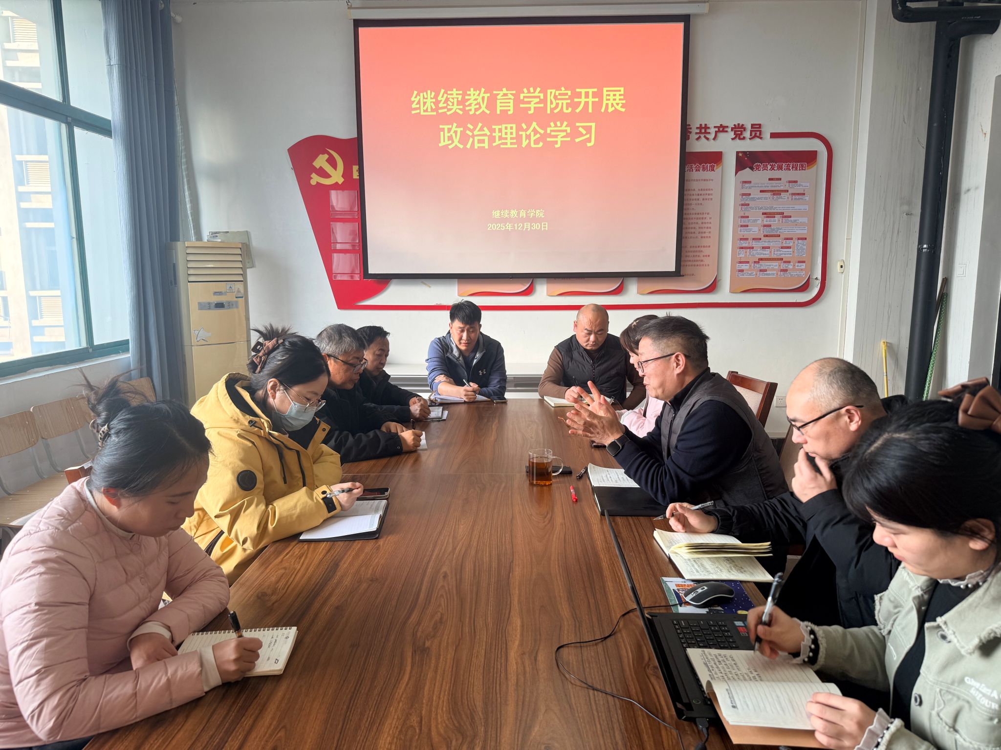 12月30日,继续教育学院在4号教学楼四楼会议室组织开展政治理论学习,会议由学院院长薛建荣主持,全体教职工参加学习。