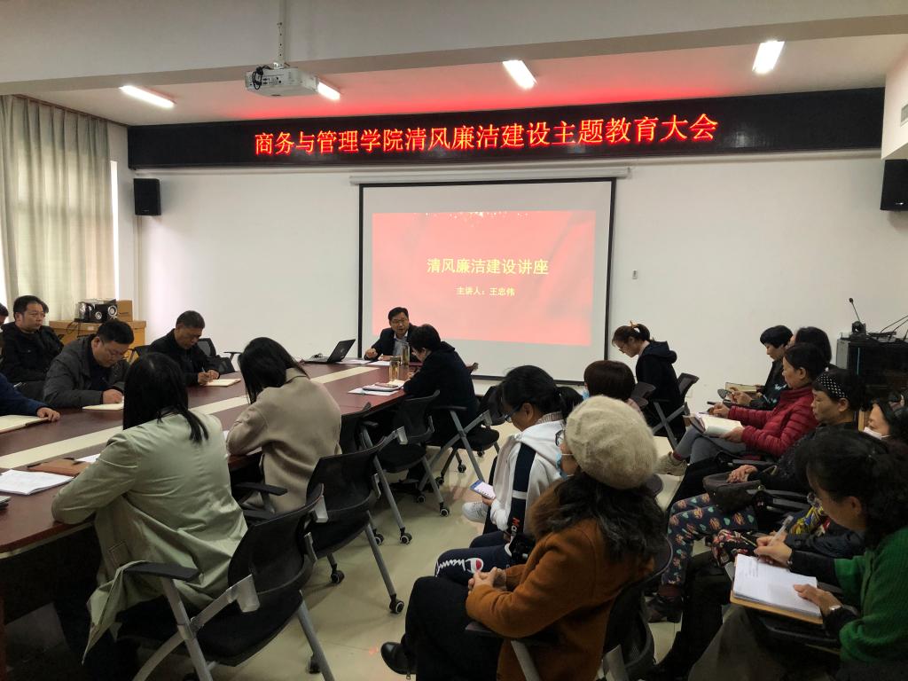 10月19日下午,商务与管理学院在党员活动室SY5420召开清风廉洁建设主题教育会议,并邀请校纪委副书记王忠伟作题为“以案为戒、真抓实干、促干部作风建设”的主题讲座。