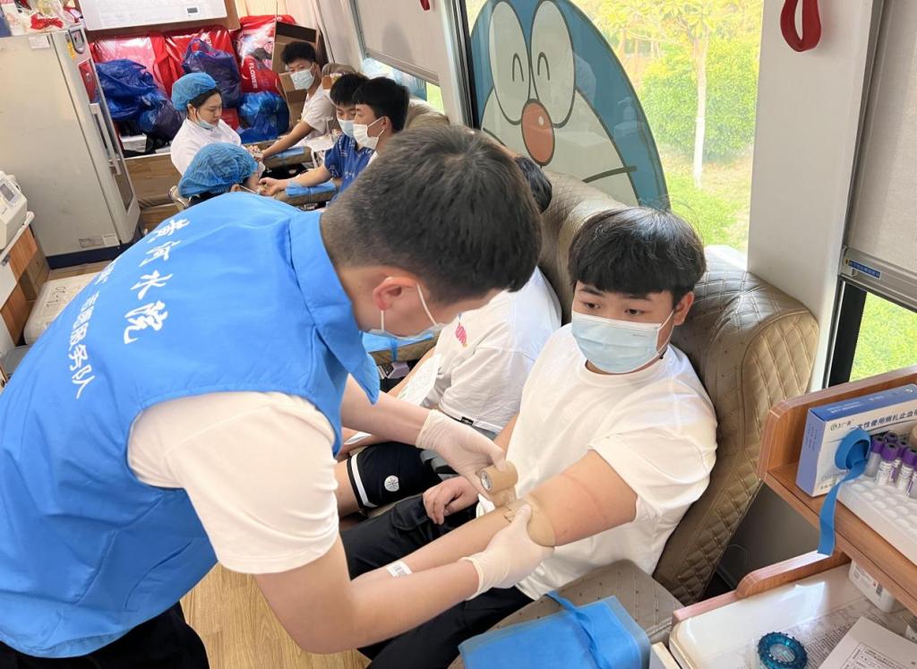 协助医务工作人员帮助献血同学缠绕绷带止血