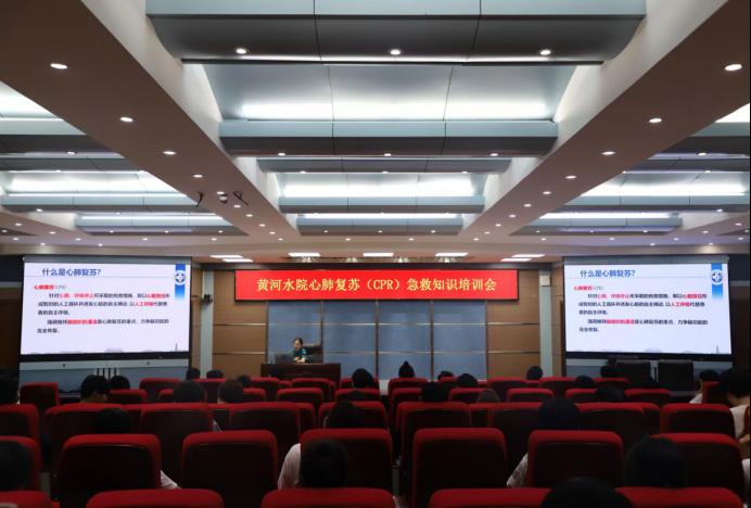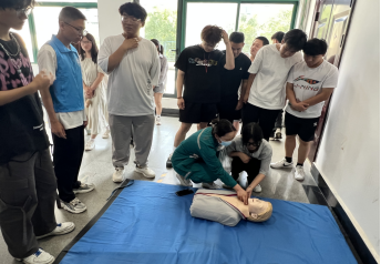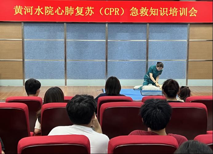 本次培训主要采取理论指导、模拟演练与现场互动相结合的方式进行培训教学。在理论指导环节,主讲医护魏鸣老师结合大量临床实例,利用PPT、图片、视频等深入浅出地向同学们介绍了学习心肺复苏的意义及基本常识,重点强调急救程序与技术要领——如人工呼吸法、如何判断患者意识,急救手法操作要领及判断心肺复苏成功的标志等。模拟演练环节,医护人员通过对“模拟人”实施心脏复苏抢救操作进行了演示,包括判断是否丧失意识、有无自主呼吸、有无脉搏,进行胸外心脏按压、清理口腔异物、开放气道、人工呼吸等操作要领的示范。随后,在医护人员的指导下,学生共分为4组分别在人体模型上进行心肺复苏实操练习,并逐一进行讲解与指导。水利工程学院刘润东表示:“通过心肺复苏(CPR)急救专业知识的培训,提高我们应对突发事件的能力,帮助我们掌握心肺复苏技能,如果未来我们遇到因心脏骤停而产生的突发紧急情况,能够在黄金救援4分钟进行施救,提高挽救更多生命的概率,这是一次很有意义的培训,希望能够有机会再次进行培训与练习。”