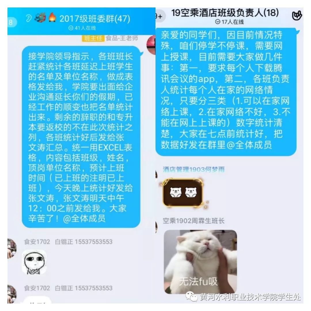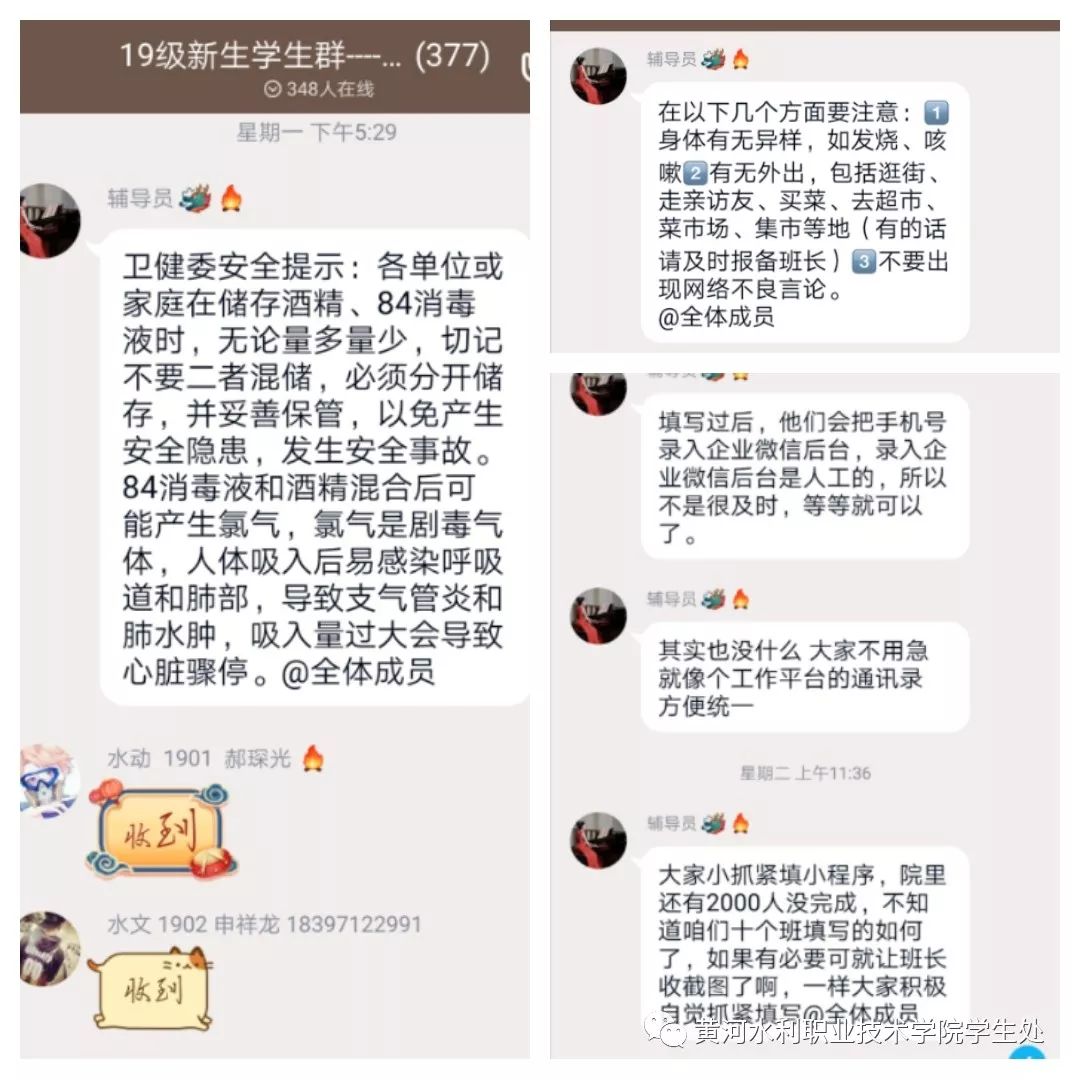 在假期期间,辅导员们不厌其烦的叮嘱同学们在家注意自身安全,以及向各个同学转达学校的各项通知,并且让同学们积极配合学校的各项工作